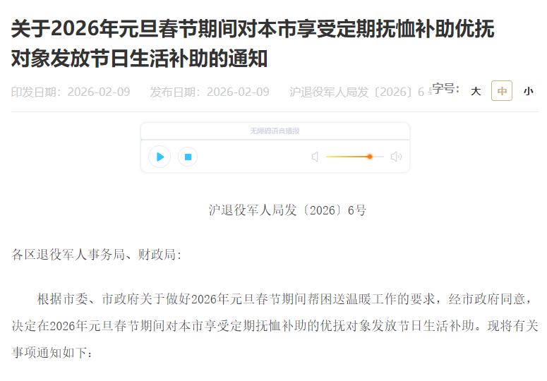 据上海市政府网站音信,近日,上海市退役军东说念主事务局、上海市财政局印发《对于2026年元旦春节工夫对本市享受依期抚恤援手优抚对象披发节日生计援手的奉告》。